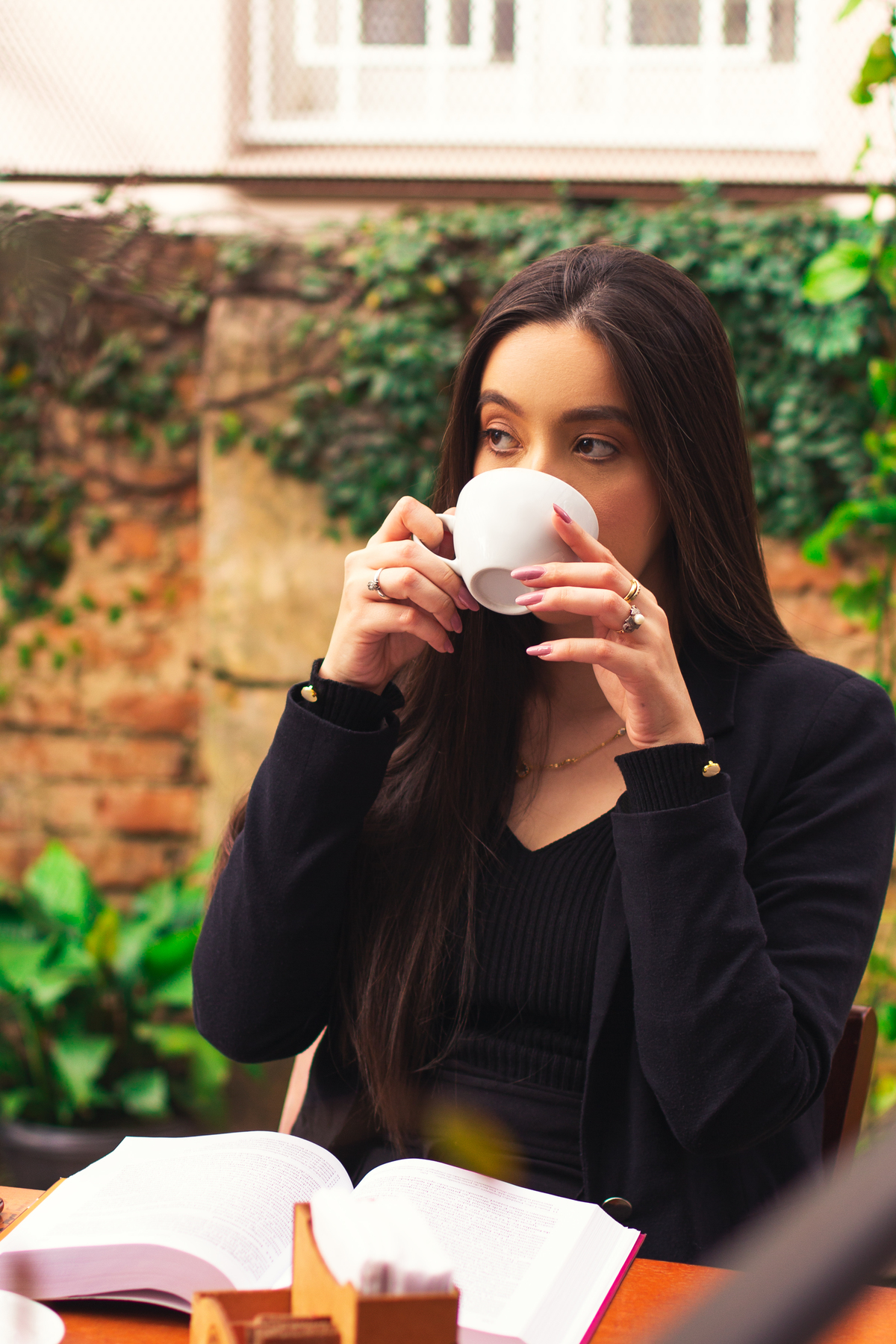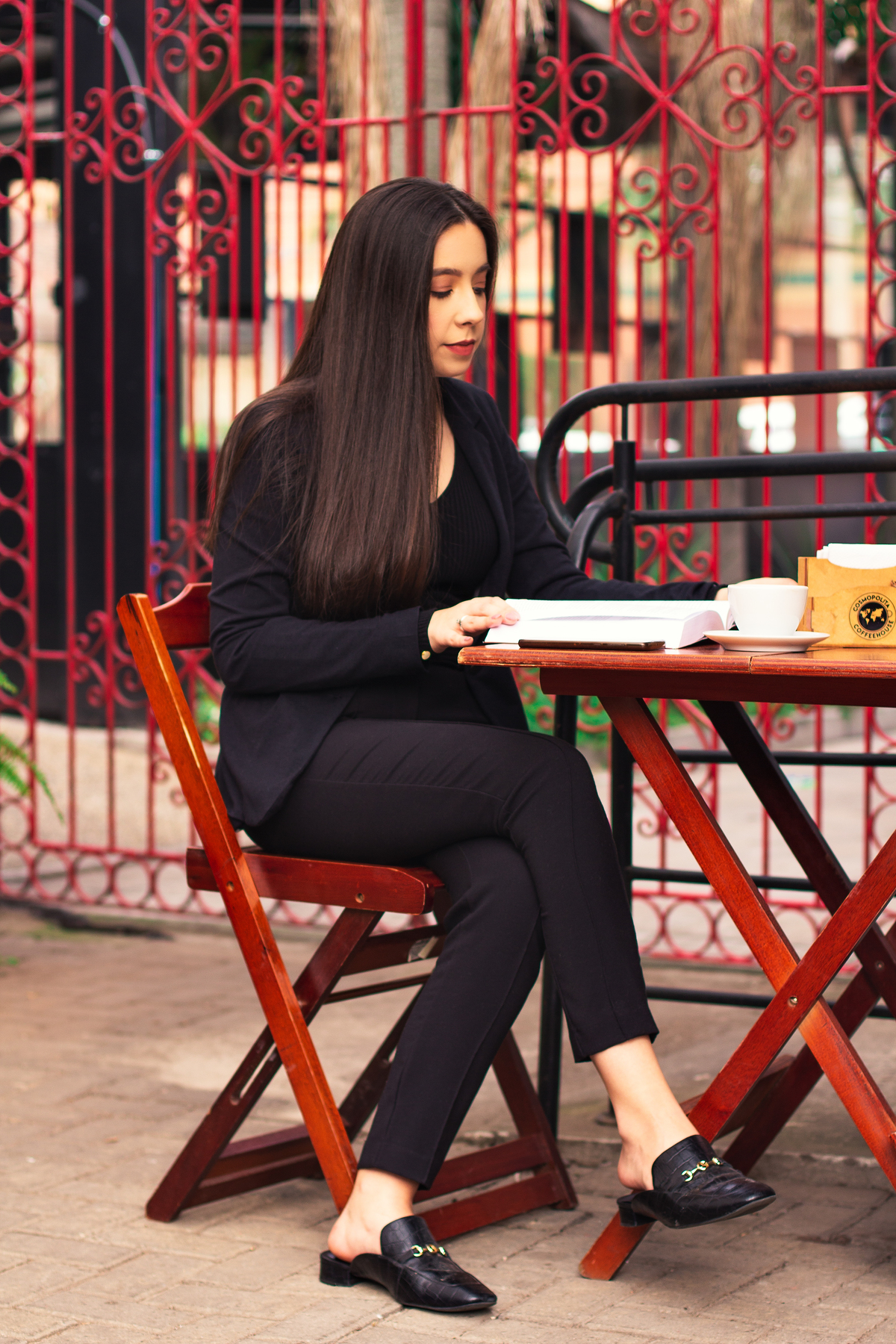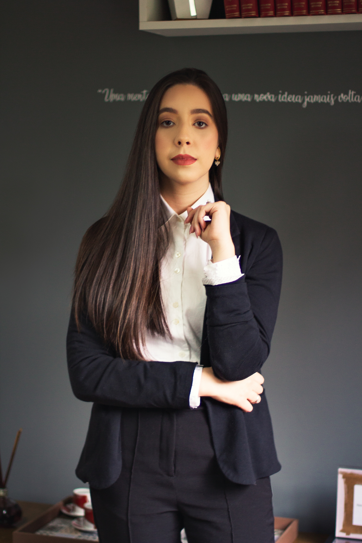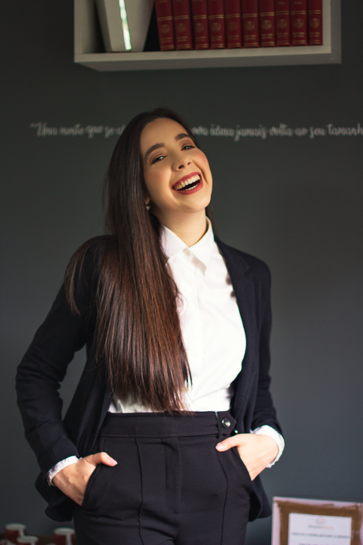 A Mariana é advogada e queria dois estilos de fotos: mais sérias e ambientadas em escritório e também mais descontraídas e não engessadas na imagem séria que geralmente a profissão passa. Fizemos o ensaio em duas locações e ousamos nos looks com cores - que já faziam parte do guarda-roupa da Mari.
